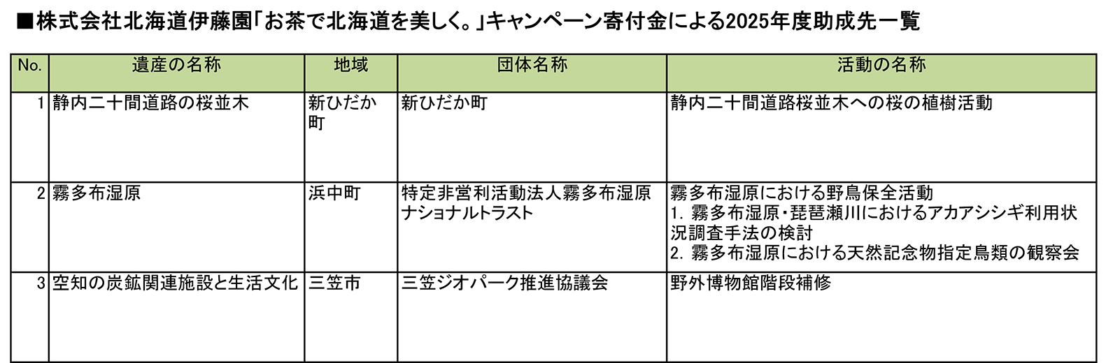 「お茶で北海道を美しく。」キャンペーン 2025年度助成事業団体は、厳正な審査の結果、右記の3団体の皆様に決定いたしました。皆様の活動の様子は北海道遺産協議会のSNS等や協議会主催イベント等で随時お知らせいたします。