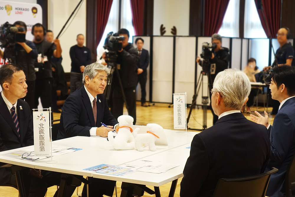 贈呈式にはイオン北海道株式会社 青栁英樹社長、小寺博之営業本部長、北海道鈴木直道知事にご列席いただきました。懇談の席ではNPO法人北海道遺産協議会会長 小玉俊宏よりご支援に対する感謝と昨年度の助成活動についてご報告し、鈴木知事より長年のご支援に対する感謝の意をお伝えいただきました。