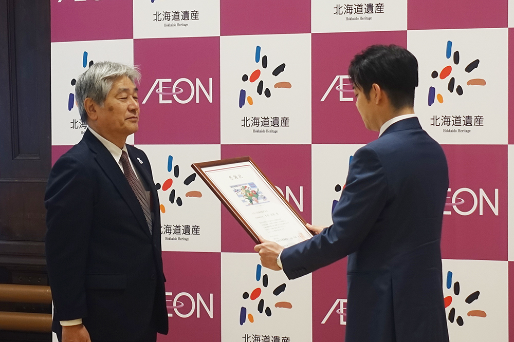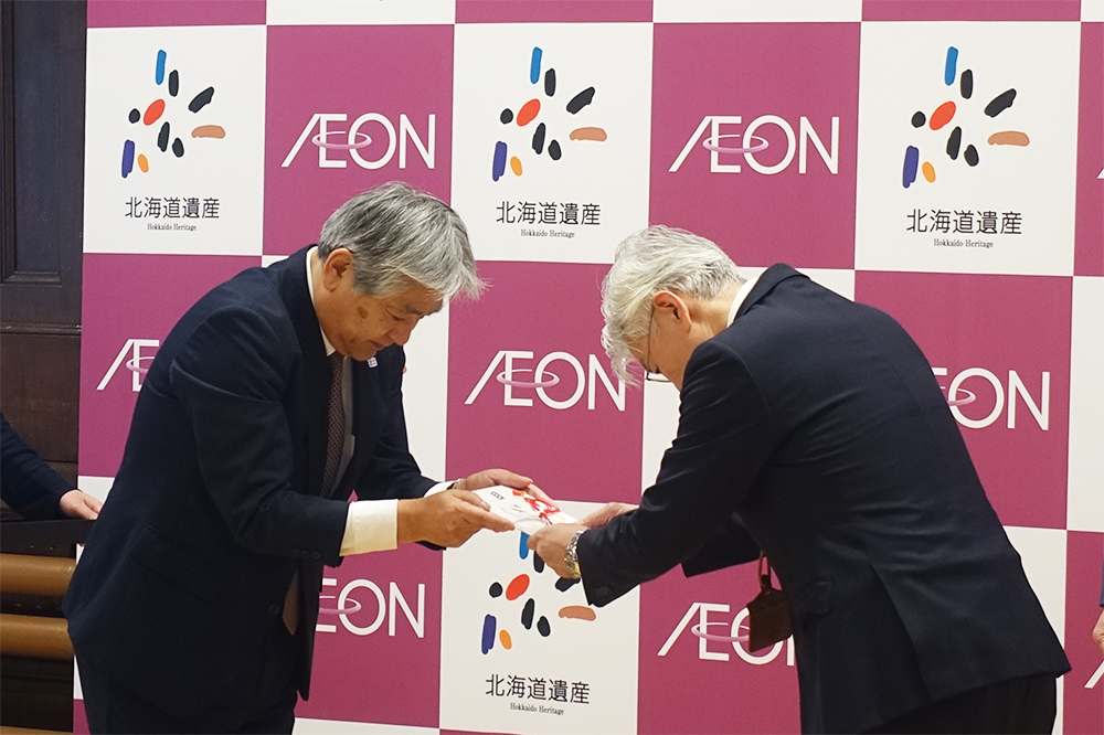 北海道遺産(どーいさん)の日でもある10月13日(月・祝)、北海道庁旧本庁舎(赤れんが庁舎)にて令和5・6年度「ほっかいどう遺産WAON」寄付目録・感謝状贈呈式を執り行いました。イオン北海道株式会社様発行の電子マネー「ほっかいどう遺産WAON」の利用額の一部として、令和5年度は1,769万3,239円、令和6年度は1,737万8,818円のご寄付をいただいております。平成23年度からの累計寄付金額は1億7,892万0,471円となり、これまでに計201件の道内各地の北海道遺産の保全・活用に関する取組みに対する助成が行われています。