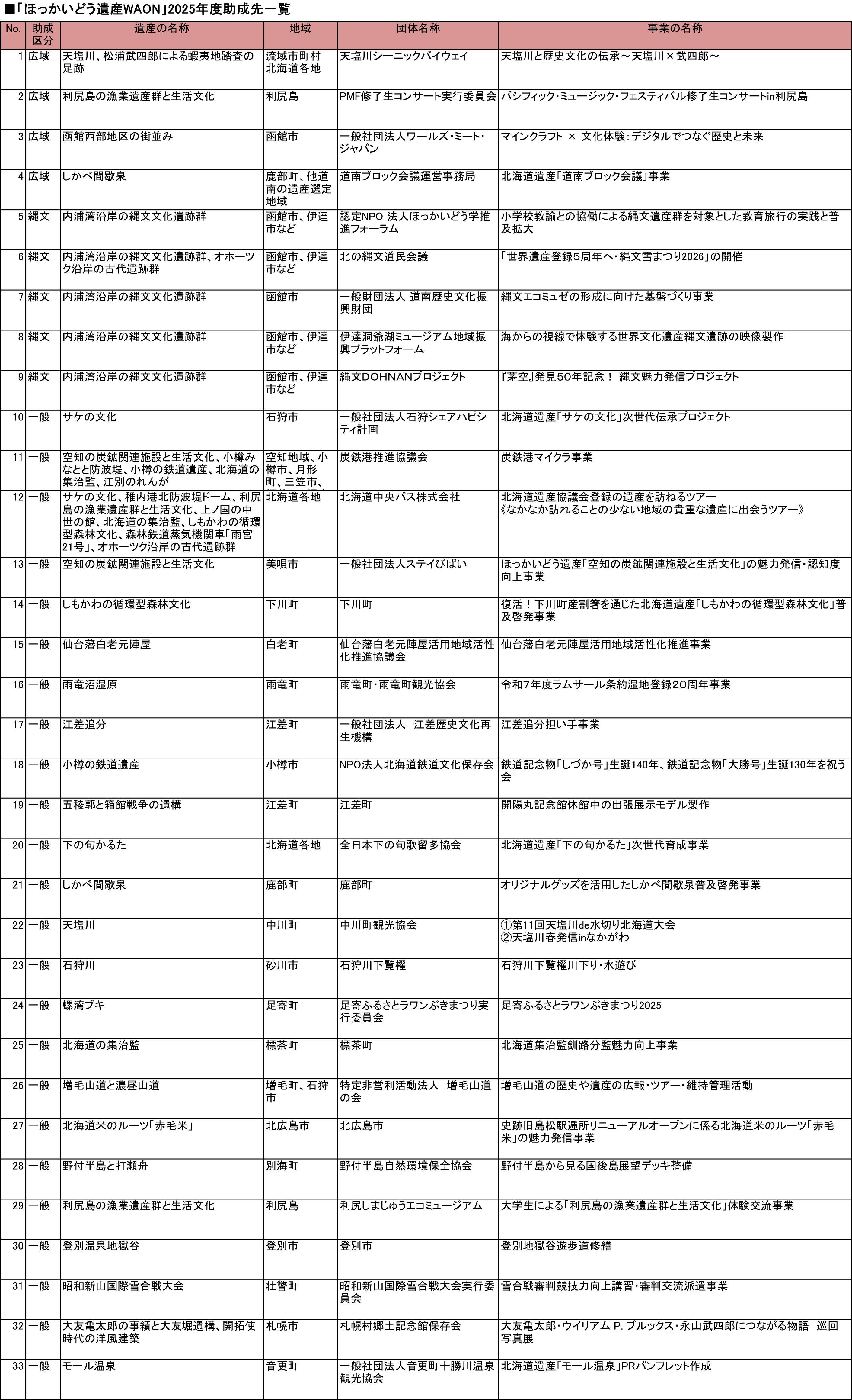 2025年度「ほっかいどう遺産WAON」助成事業団体は、厳正な審査の結果、右記の33団体の皆様に決定いたしました。皆様の活動の様子は北海道遺産協議会のSNSや協議会主催イベント等で随時お知らせいたします。
