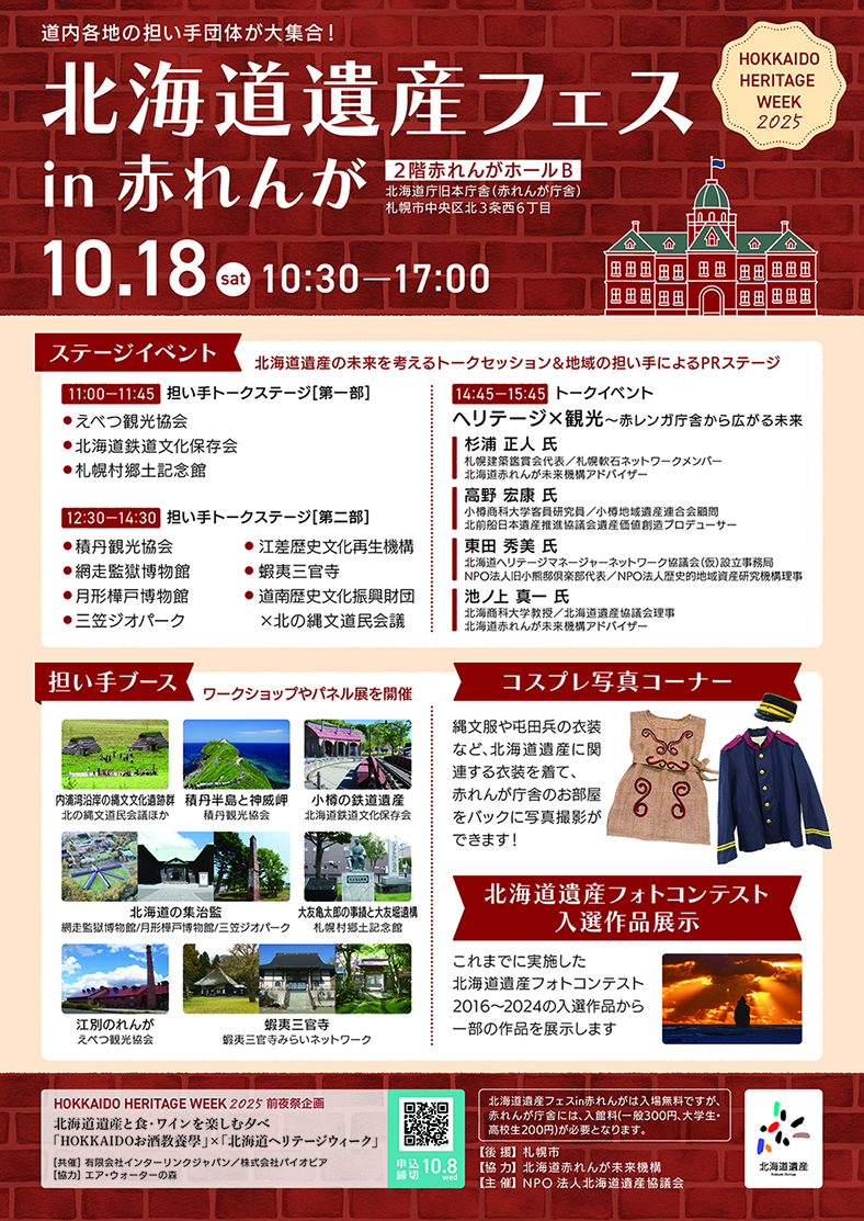 「北海道ヘリテージウィーク2025」のメイン事業として、7月にリニューアルオープンした赤れんが庁舎を会場に地域の担い手が集合し、 各遺産の魅力を紹介するPRイベントを開催します。 ステージイベントでは地域の担い手によるトークステージと、「ヘリテージ×観光」と題した有識者によるトークイベントを実施します。 担い手ブースでは、各遺産に親しむワークショップやパンフレット配布などを行いますので、担い手から歴史やおすすめポイントなどを聞くことができる機会です。