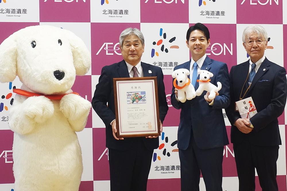 北海道遺産(どーいさん)の日でもある10月13日(月・祝)、北海道庁旧本庁舎(赤れんが庁舎)にて令和5・6年度「ほっかいどう遺産WAON」寄付目録・感謝状贈呈式を執り行いました。イオン北海道株式会社様発行の電子マネー「ほっかいどう遺産WAON」の利用額の一部として、令和5年度は1,769万3,239円、令和6年度は1,737万8,818円のご寄付をいただいております。平成23年度からの累計寄付金額は1億7,892万0,471円となり、これまでに計201件の道内各地の北海道遺産の保全・活用に関する取組みに対する助成が行われています。