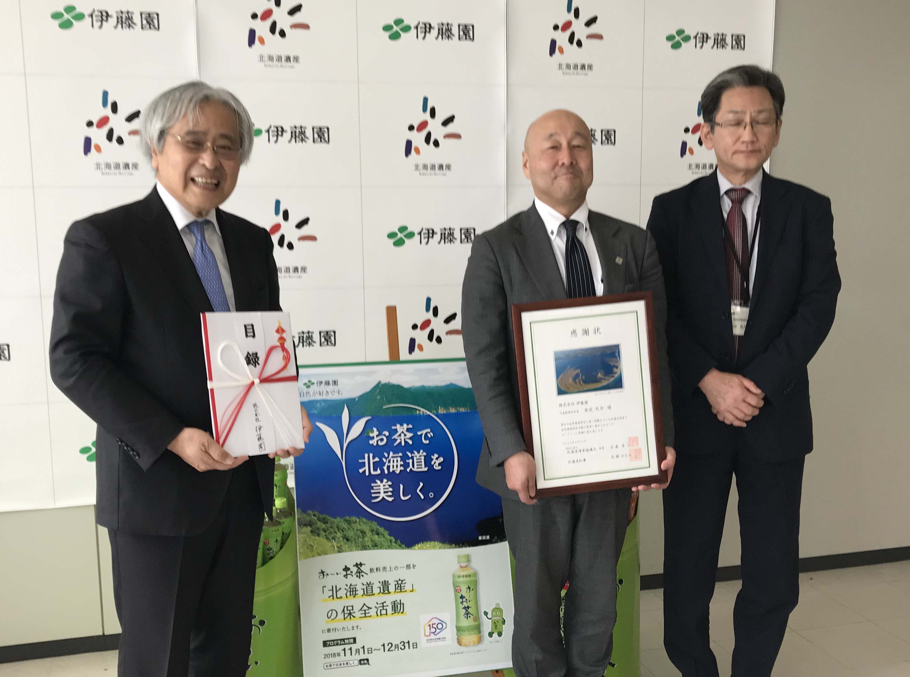 株式会社伊藤園様では、「おーいお茶」の売上の一部を、日本各地の環境保全・整備活動と自然豊かな環境づくりなどに取組む自治体等に寄付する「お茶で日本を美しく」キャンペーンを展開されております。北海道では平成22年度より「お茶で北海道を美しく」キャンペーンとして、北海道遺産に選定されている地域の自然環境保全活動へのご支援をいただいており、昨年度は11月1日~12月31日までに実施されたキャンペーン期間中の売上の一部から90万円のご寄付をいただきました。