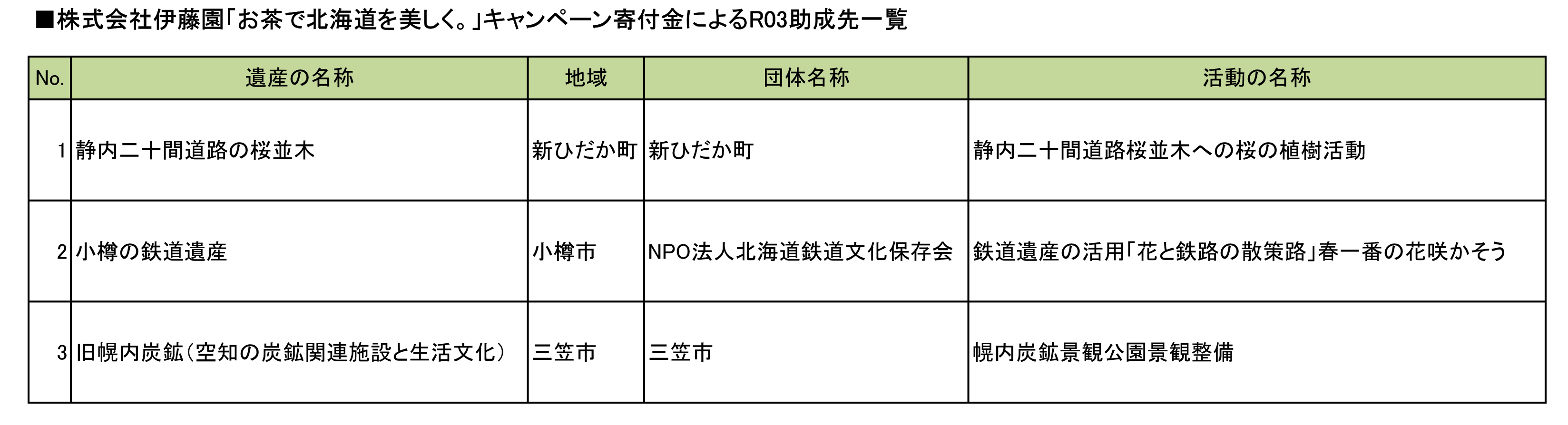 「お茶で北海道を美しく。」キャンペーン助成金活動団体は厳正な審査の結果、右記の3団体の皆様に決定いたしました。