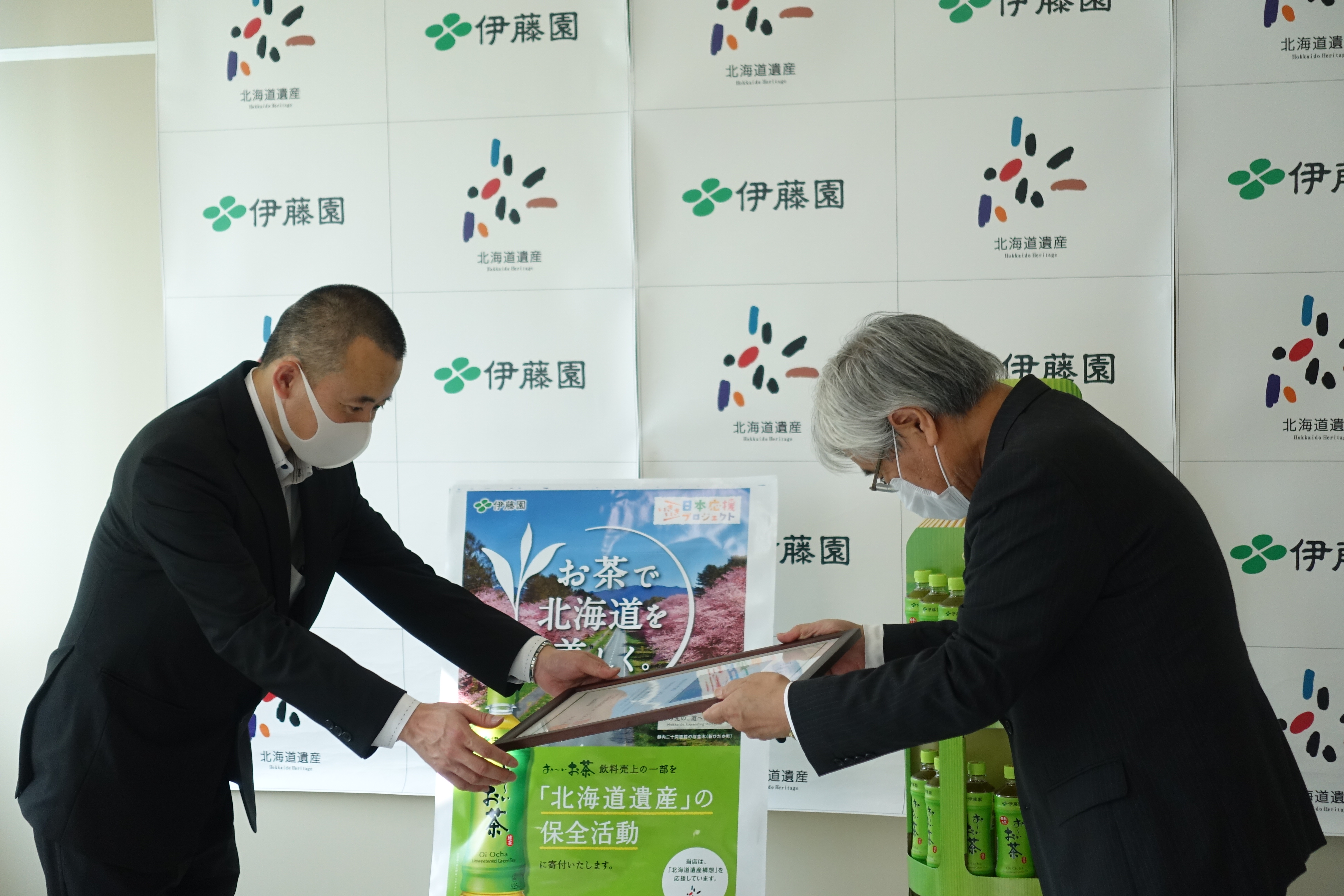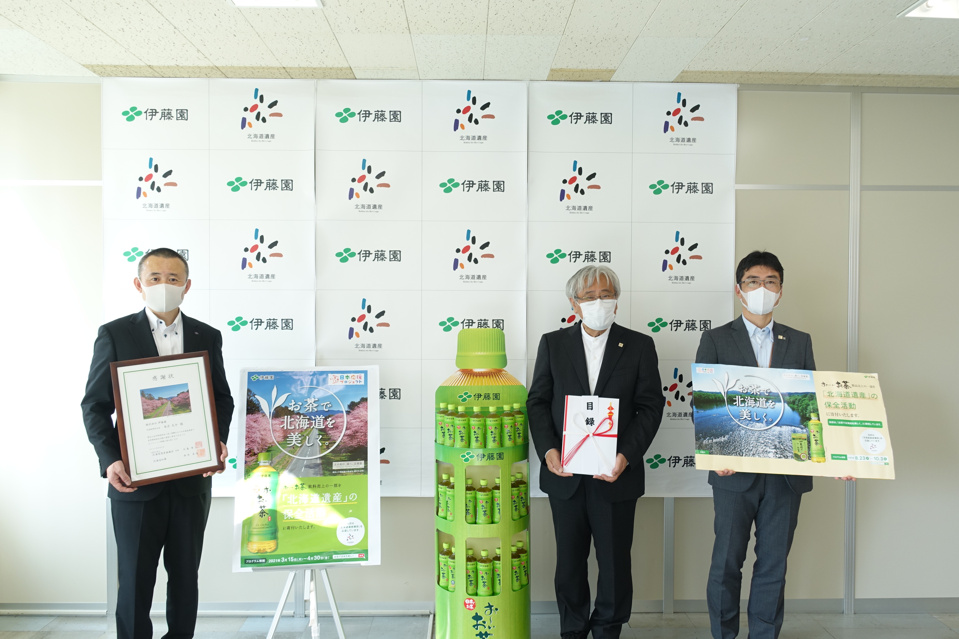株式会社伊藤園様では、「おーいお茶」の売上の一部を、日本各地の環境保全・整備活動と自然豊かな環境づくりなどに取組む自治体等に寄付する「お茶で日本を美しく」キャンペーンを展開されております。北海道では平成22年度より「お茶で北海道を美しく」キャンペーンとして、北海道遺産に選定されている地域の自然環境保全活動へのご支援をいただいており、2021年3月15日~4月30日までに実施されたキャンペーン期間中の売上の一部から80万円のご寄付をいただきました。