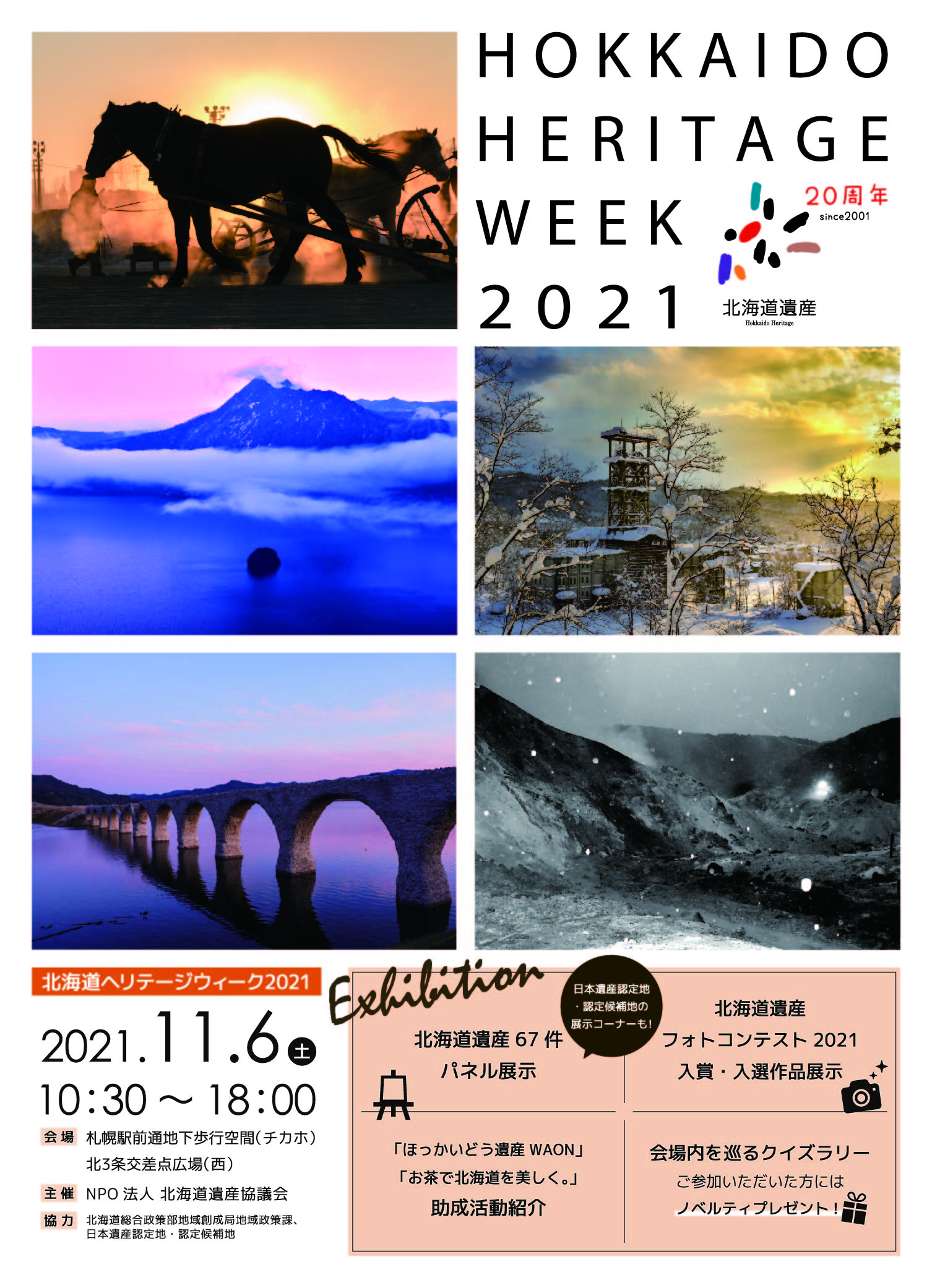 11/6(土)チカホにて「北海道ヘリテージウィーク2021」を開催します。各地の北海道遺産および日本遺産のパネル展示を行います。会場ではクイズラリーなどの企画も開催。なお、翌11/7(日)は同会場にて「地域遺産PRイベントinチカホ」(主催:北海道)が開催されますので、ぜひお立ち寄りください。