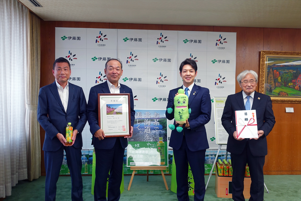 8月21日(月)、北海道庁知事会議室にて令和4年度「お茶で北海道を美しく。」キャンペーンによる寄付目録・感謝状贈呈式が行われました。目録・感謝状贈呈式には鈴木直道北海道知事にもご出席いただき、株式会社伊藤園 北海道東北地域営業本部 森川博行本部長から目録が北海道遺産協議会石森会長に手渡され、鈴木知事から森川本部長へ感謝状が贈られました。