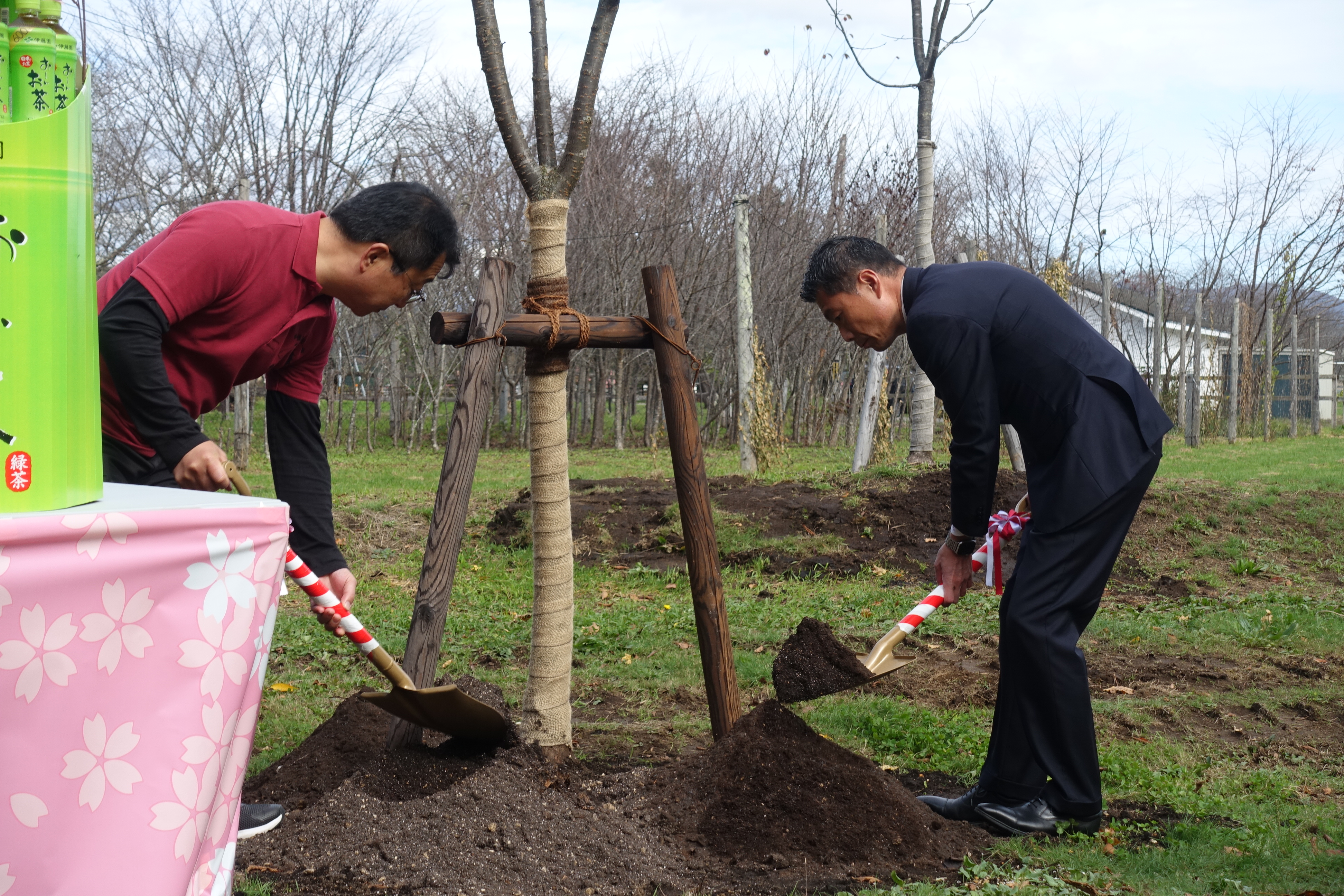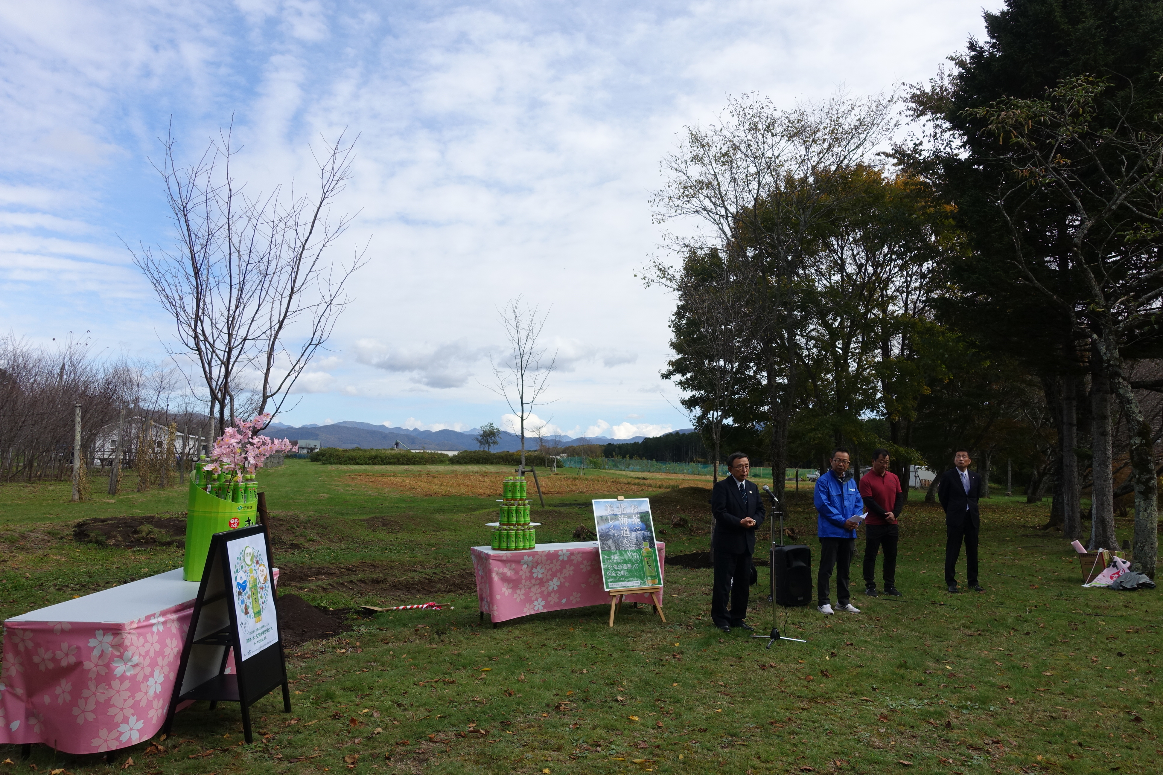 10/21(土)、新ひだか町の静内二十間道路桜並木で桜の植樹式が行われました。(株)伊藤園による『お茶で北海道を美しくキャンペーン』の一環として令和元年度より実施されており、今年で5回目となります。これまでの植樹本数は26本となりました。