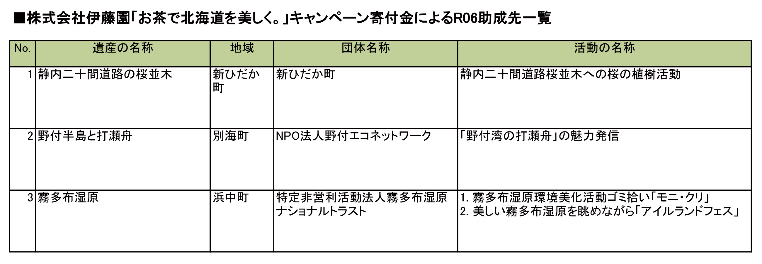 「お茶で北海道を美しく。」キャンペーン助成金活動団体は厳正な審査の結果、右記の3団体の皆様に決定いたしました。皆様の活動の様子は北海道遺産協議会のSNS等や協議会主催イベント等で随時お知らせいたします。「お茶で北海道を美しく。」キャンペーンの詳細は下記のリンクをご覧ください。(株式会社伊藤園様WEBサイト)https://www.itoen.co.jp/kirei/hokkaido.html