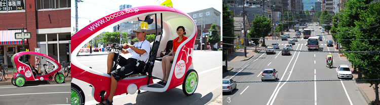まあ、それはそれとして、ベロタクシーの運転にはドライバーさんも気を使うことが多いようだ。例えば、交差点で直進する場合、最も左のレーンからの直進となるため、左折車の動きを一瞬止めることになる。そのため左折車がいたら右手で、先に曲がるよう合図をし、スムーズな交差点の運行に心がけているのだという。札幌での運行開始から数ヶ月が過ぎ、特に一般タクシーの運転手さんからは認知もされているため、お互いがうまく譲り合いながら都心を走っているそうだ。