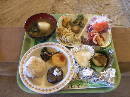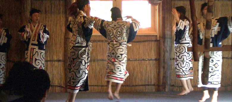 チセ内に入ると伝統的な食材を使った料理が14種類が大皿に並んでいた。バイキング形式でおかわり自由!昔から伝わる調理法で作られた料理の中に現代的にアレンジされた料理も並ぶ。それぞれがお盆に好きなだけ料理を盛り、囲炉裏を囲んでいただいた。メニュー表が配られたあと、それぞれの料理について解説を受けた。
