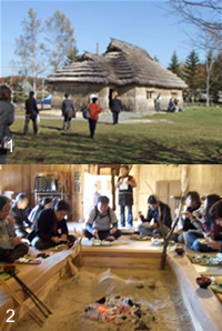 昼食をとるため別のチセに移動する。博物館の敷地内には大小いくつかのチセがあり、小さな村のような景色が広がっている。