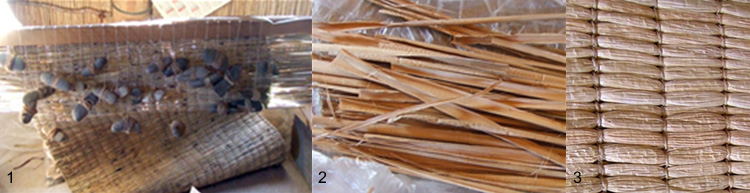 1 糸が巻かれた石が並ぶイテセニ(ゴザ編み機) 2 材料のガマ。これを2本使って1段分となる 3 編みあがったトマ