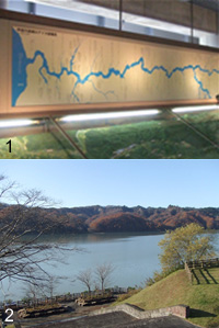 その後、建物の屋上にあがり、二風谷湖と対岸の森林を見ながら、国の重要重要文化的景観に選定されている「アイヌの伝統と近代開拓による沙流川流域の文化的景観」について学んだ。重要文化的景観とは、国が選定する景観の文化財で、生活や生業・風土によって形成された景観が選ばれている。平取町の文化的景観はアイヌの伝統と近代開拓が景観を形づくっているが、今回は特にアイヌの伝統がわかる景観について解説を受けた。