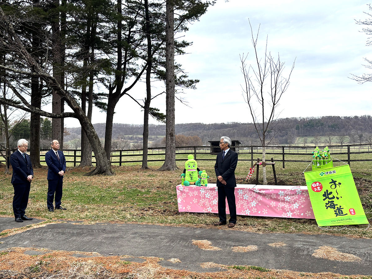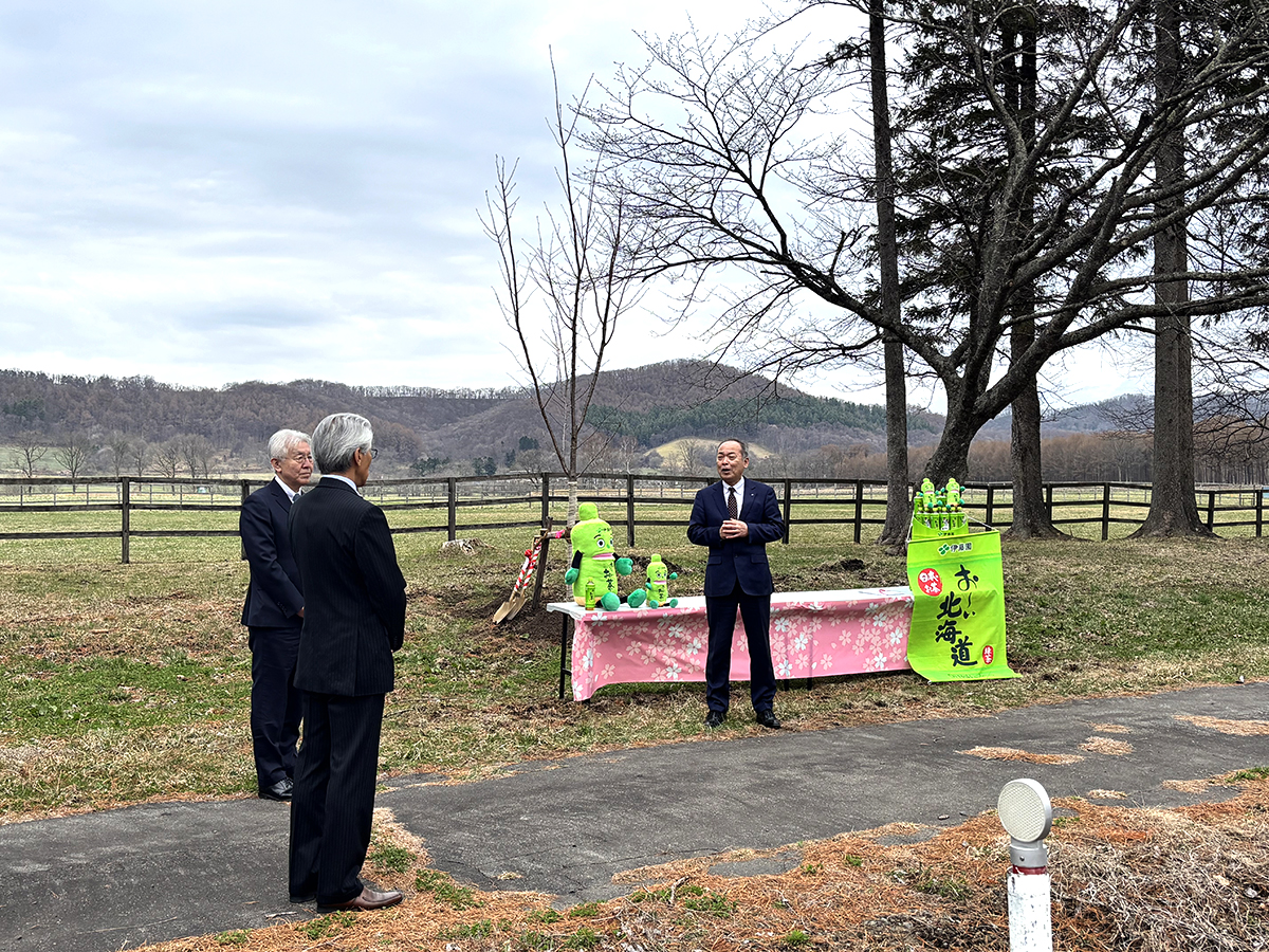 2026/4/10(金)、新ひだか町の静内二十間道路桜並木にて、北海道伊藤園森川社長、新ひだか町大野町長、当協議会小玉会長が出席し、桜の植樹式が行われました。