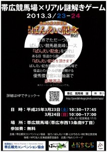 日 時: 2013年3月23日(土)10:30~17:45 3月24日(日)10:00~17:00 場 所: 帯広競馬場(帯広市西13条南9丁目) 参加費: 無料