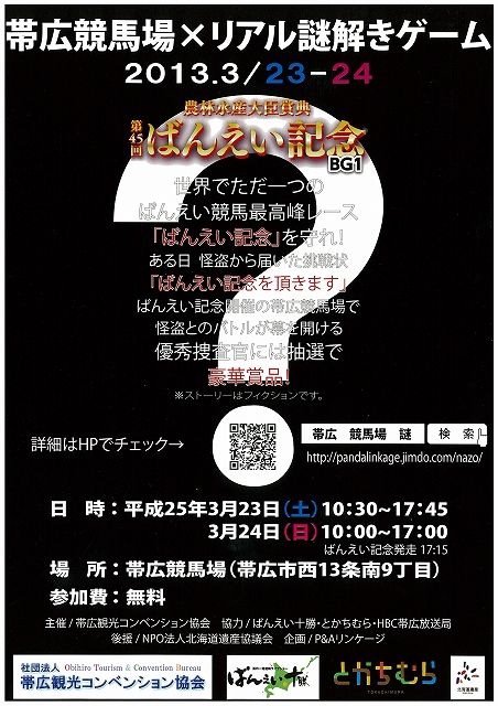 世界でたった一つのばんえい競馬。その最高峰レース「ばんえい記念」が開催される帯広競馬場を舞台に、リアル謎解きゲームが開催されます。 多くの謎を解いた人には豪華賞品が!ぜひ足をお運びください。