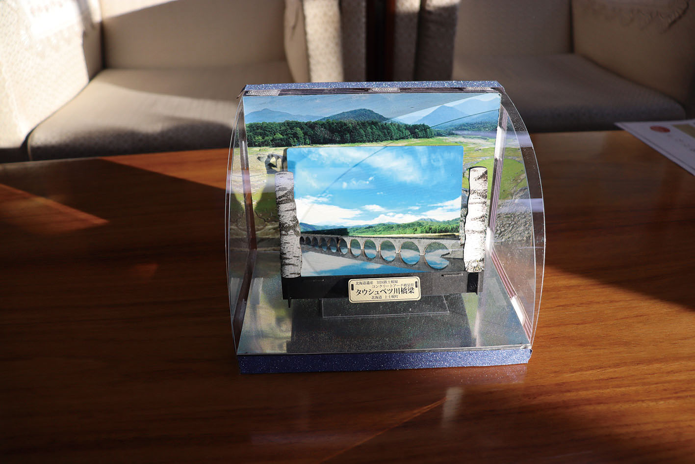 士幌線を中心とした歴史は、日本の昭和史をみることだと河田氏はいう。戦前から戦後、士幌線や糠平ダムを中心とした山間部での開発事業には昭和という時代が凝縮してみられる。そのような歴史の証のひとつである第三音更橋梁は、補修・再生工事を終えた。しかし、毎年、湖に沈んでは現れ、凍結を繰り返すタウシュベツの劣化も激しい。変わりゆく橋の姿を記録しようと河田氏主導によるクラウドファンディングで制作されたタウシュベツ橋梁の模型は、上士幌町の教育委員会とぬかびら源泉郷郵便局に寄贈され、現在両所で展示されている。