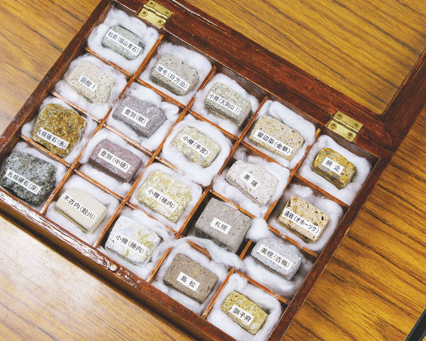 札幌軟石の「担い手」は、札幌軟石ネットワークが担っている。事務局長の佐藤俊義氏に話を聞くと、鉱石の標本コレクションのような懐かしい木箱におさめられた石コレクションを見せて下さった。札幌硬石から松前の福山靑石など、北海道内の石と比べると、軟石の特徴がよくわかる。支笏湖ができた時の噴火で火砕流が石山(札幌市南区)にも流れてきた。これが冷えて固まったものが溶結凝灰岩で、後に札幌軟石といわれるようになる。