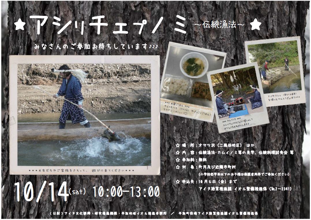 アイヌ民族の伝統的な漁具、漁法で鮭の採捕を行ない、今年の鮭を迎える、「アシリチェプノミ」が10/14(土)に平取町で行なわれます。