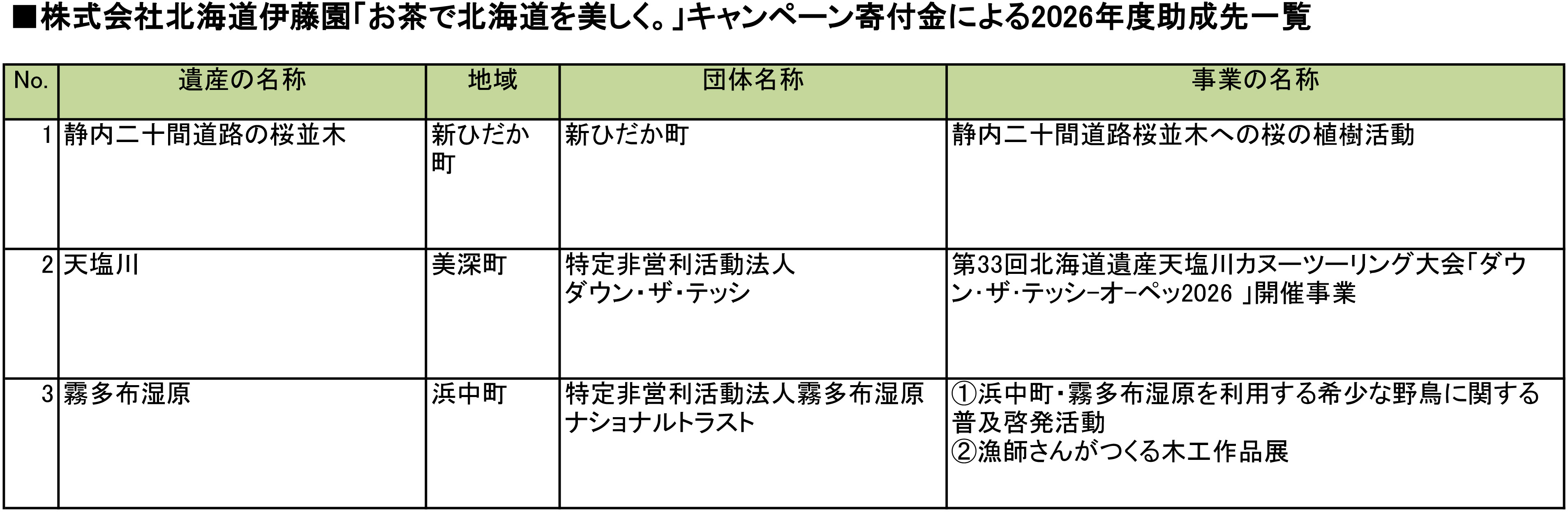 「お茶で北海道を美しく。」キャンペーン 2026(令和8)年度助成事業団体は、厳正な審査の結果、右記の3団体の皆様に決定いたしました。皆様の活動の様子は北海道遺産協議会のSNS等や協議会主催イベント等で随時お知らせいたします。