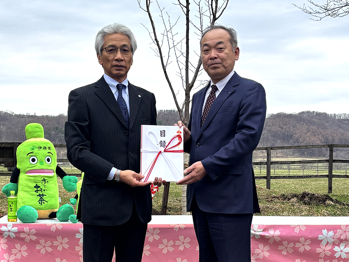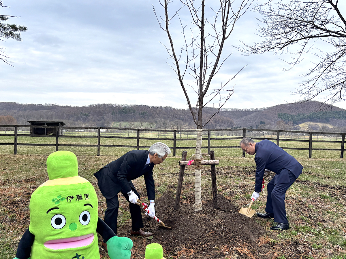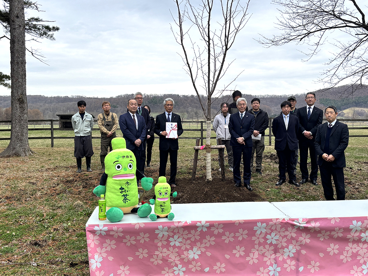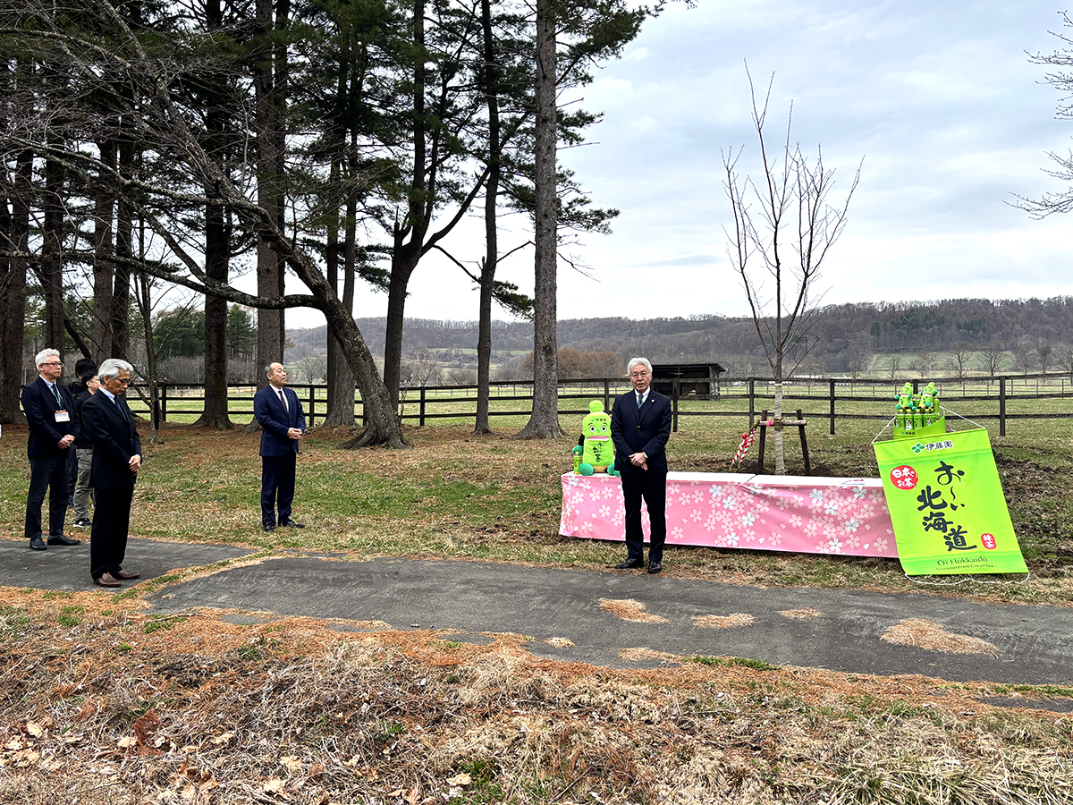 2026/4/10(金)、新ひだか町の静内二十間道路桜並木にて、北海道伊藤園森川社長、新ひだか町大野町長、当協議会小玉会長が出席し、桜の植樹式が行われました。